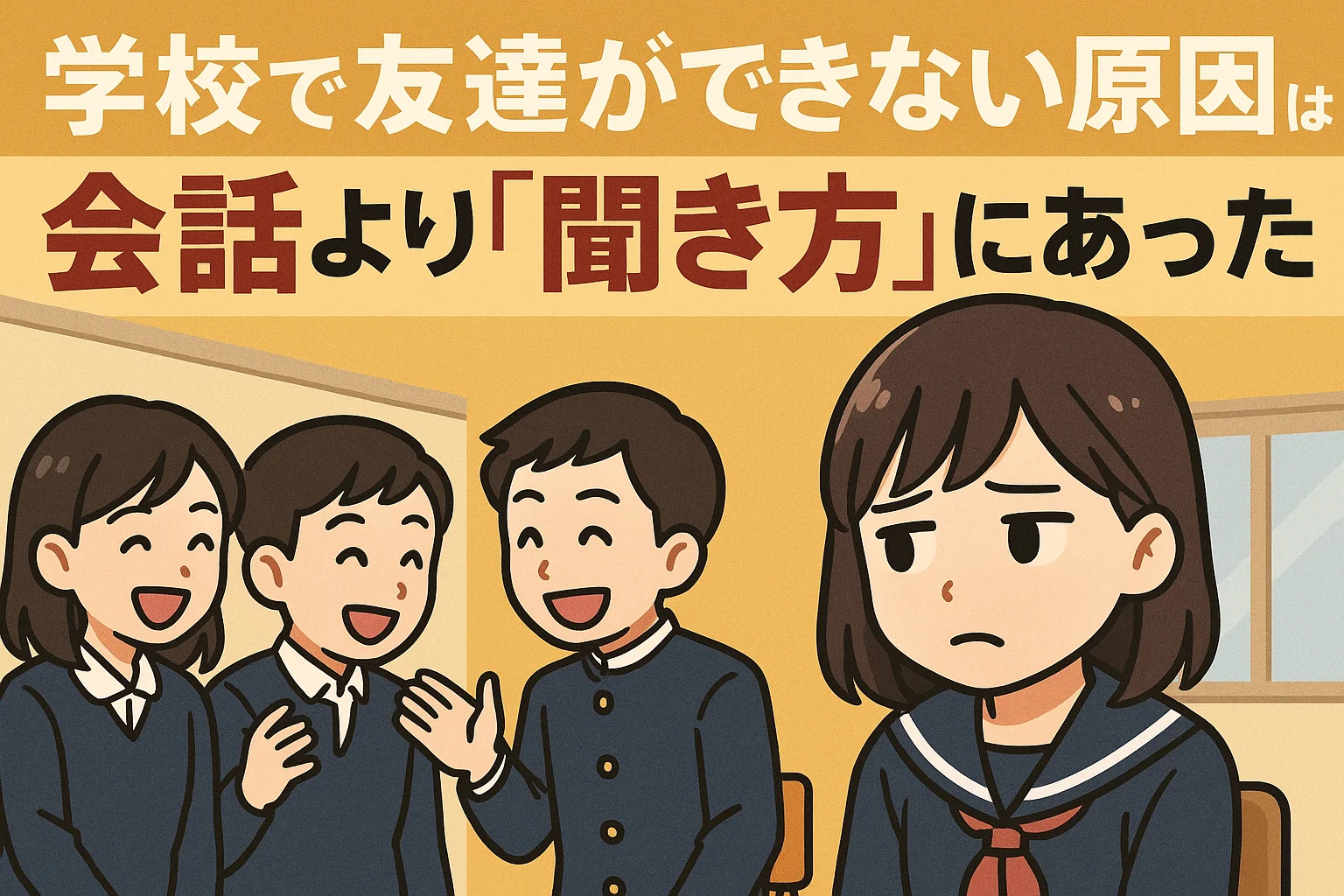 教室で輪になって話しているグループに入る瞬間って難しいですよね。僕はよく立ち尽くしていました。「話題に付いていけなかったらどうしよう」と不安になり、結局誰とも話せない。これも聞き方が未熟なサイン。相手の会話に耳を澄ませて「キーワード」を拾えれば、途中参加でも自然に合流できるんです。